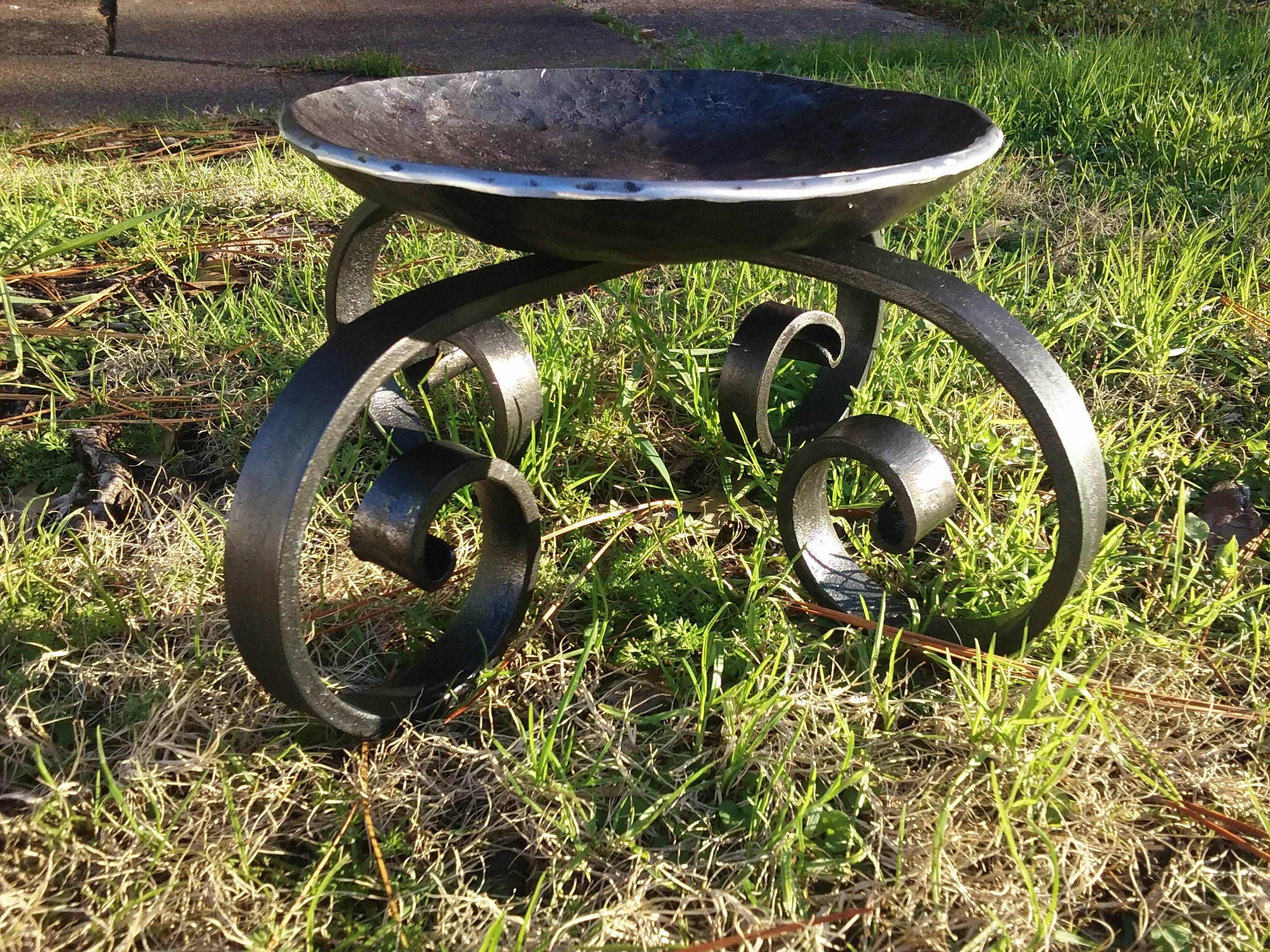 This one of a kind extra large, standing bowl was hand forged from quality 1/4" A36 steel with a gentle, even concave curve and hammer textured forge finish. The bowl sits proudly on two very intricate "C" scrolls making four legs and is secured with hand forged rivets using traditional, iron age techniques.