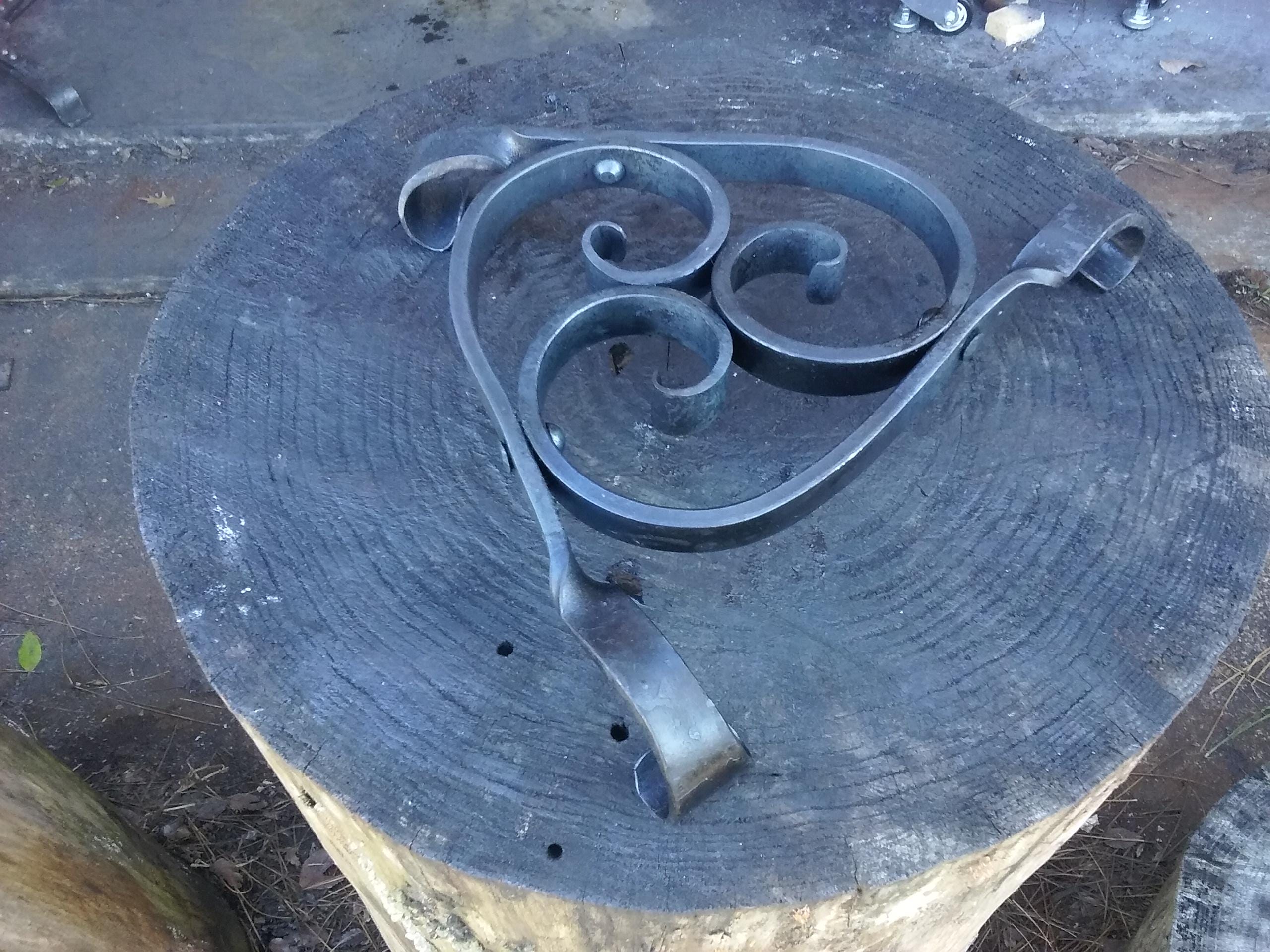 This one of a kind, heavy duty scroll trivet was hand forged from quality 3/4" A36 steel using hand tools and traditional methods only. The three matching scrolls were shaped by hand to join perfectly in the center to form a triskelion and secured with hand forged rivets. The three legs curve gently down to form a solid, level surface for your cast iron pans or whatever else you might want to place on it.